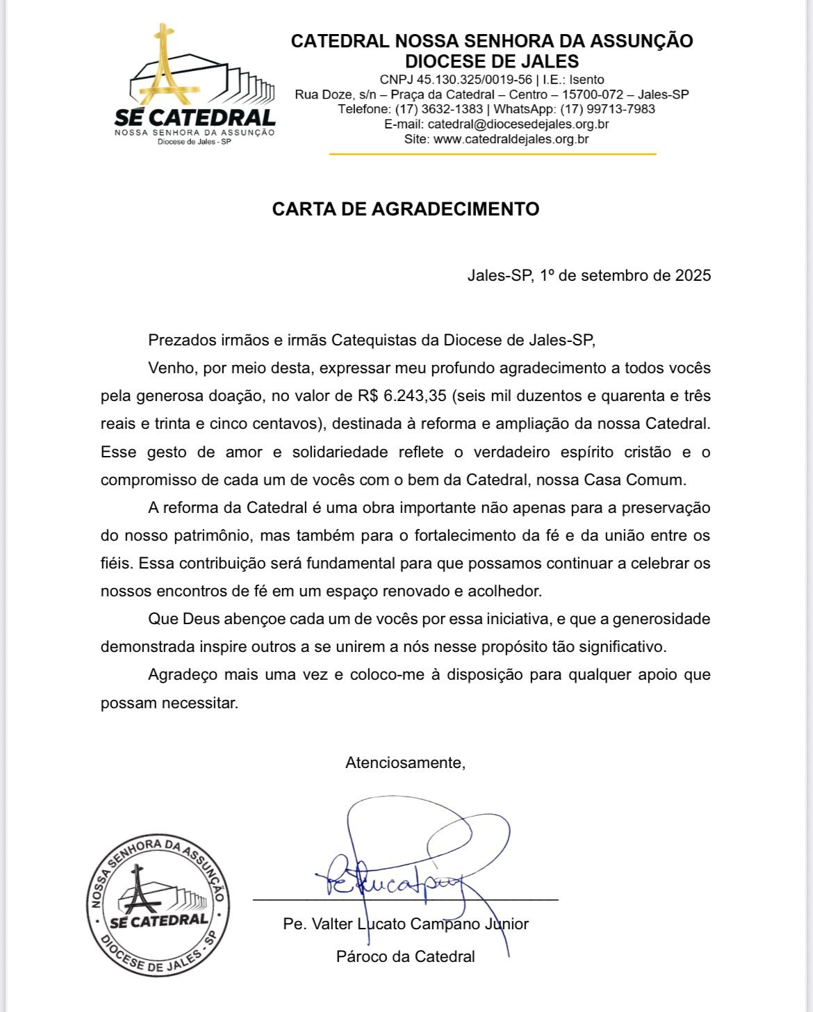 Carta de Agradecimento - Catequistas da Diocese de Jales